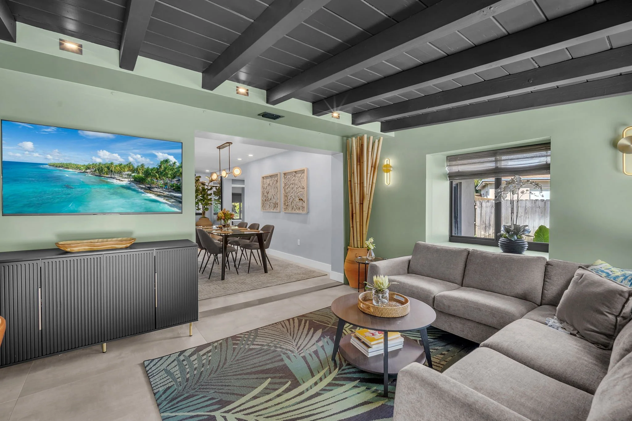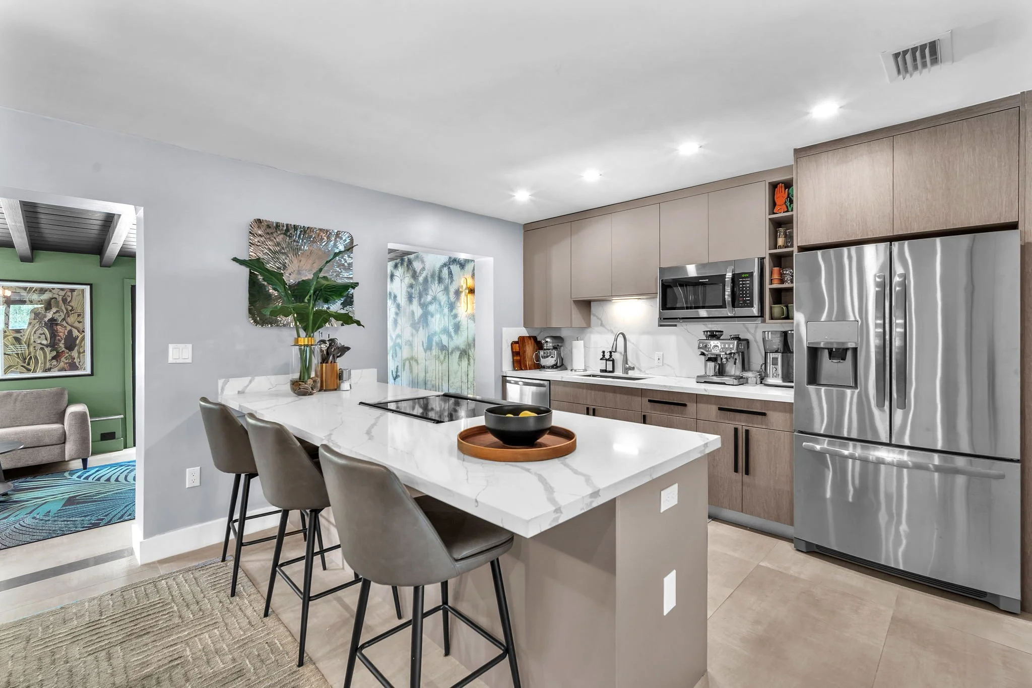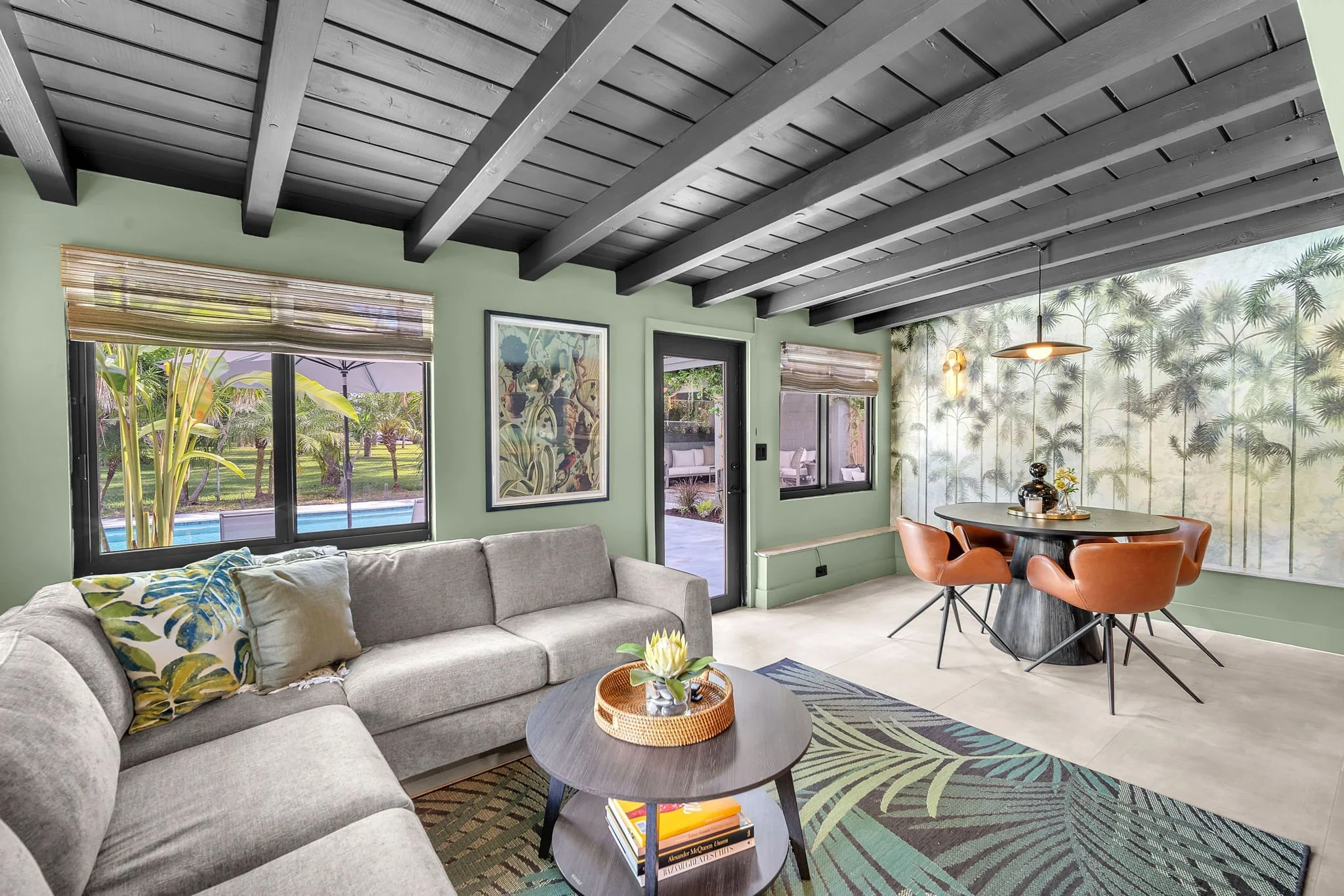 Almost Famous is a contemporary-meets–mid-century retreat designed for style and relaxation, featuring four bedrooms, luxe décor, and a laid-back, lounge-inspired vibe.